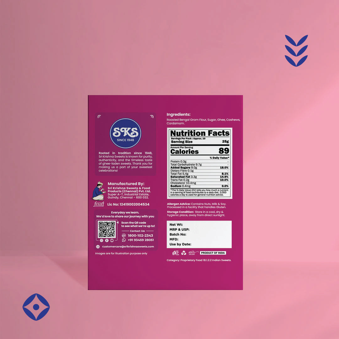 Rava Laddu blends roasted semolina, pure ghee, and sugar into a soft, grainy delight that melts effortlessly on the palate. It delivers warm, traditional sweetness in every bite, crafted with uncompromising authenticity.