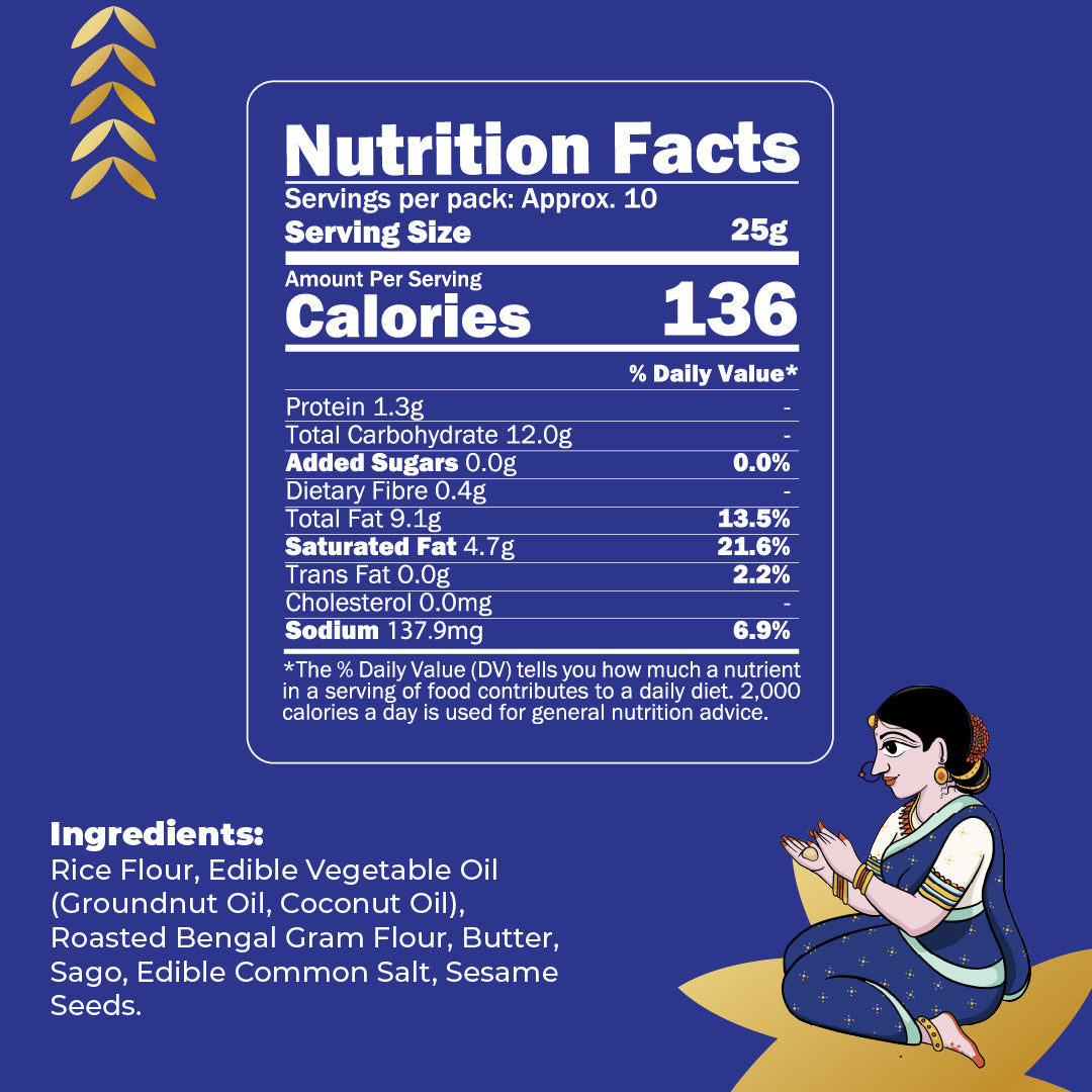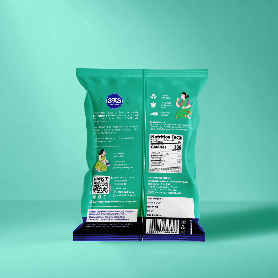 Made with traditional Chettinad methods, our seedai blends stone-ground rice and toasted sesame seeds to create an irresistibly crisp, aromatic snack rooted in heritage.