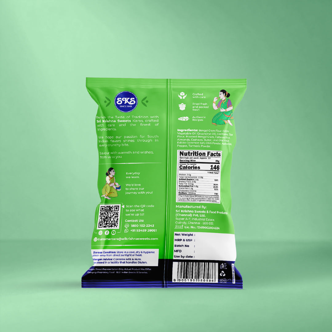 Savor the authentic taste of Nellai Mixture, a classic savory snack crafted with golden besan flour, crispy cornflakes, and rice flakes. Deep-fried to perfection and seasoned with aromatic spices, this traditional blend delivers irresistible crunch and flavor in every handful. A timeless favorite that brings genuine South Indian taste to your table.